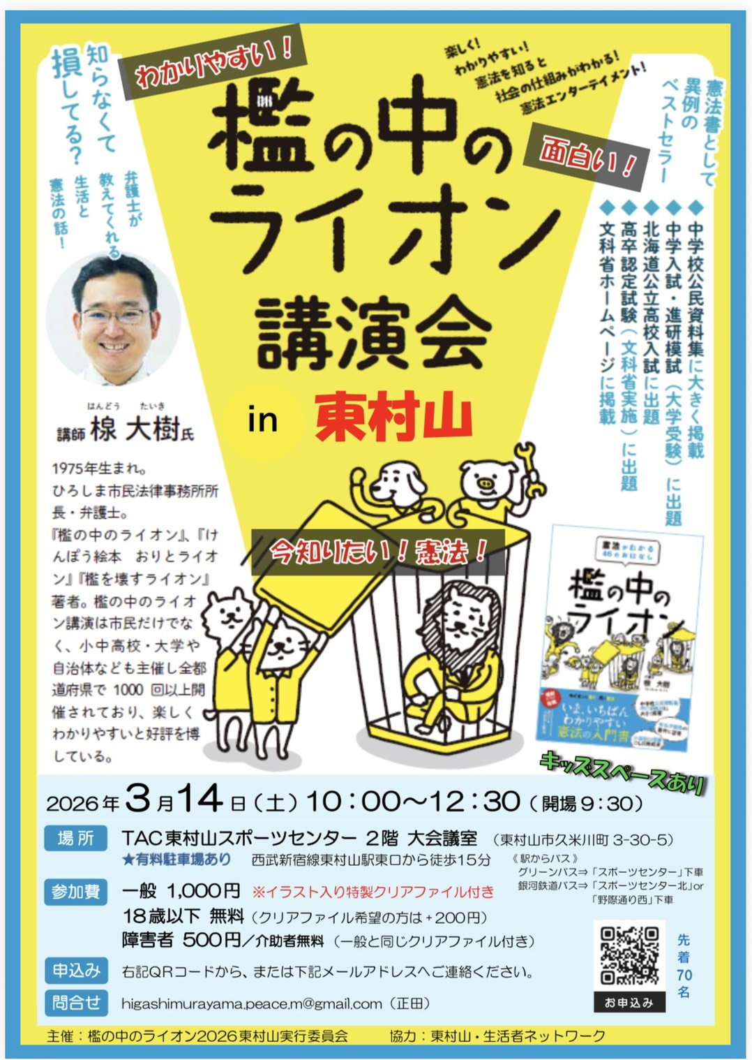 2026年3月2日 / 最終更新日 : 2026年3月2日 hmy トピックス 「檻の中のライオン」講演会in東村山 「檻の中のライオン」の著者、楾大樹氏の講演会を東村山で開催します。 憲法改正?に向けての動きが高まってきています。まずは、憲法を正しく理解するために、 ぜひご参加ください! 日時:2026年3月14日(土)10:00~12:30(開場9:30) 場所:TAC東村山スポーツセンター 2階大会議室 申込み:チラシの二次元コードまたはメール higashimurayama.peace.m@gmail.com へ FacebookXBlueskyHatenaCopy