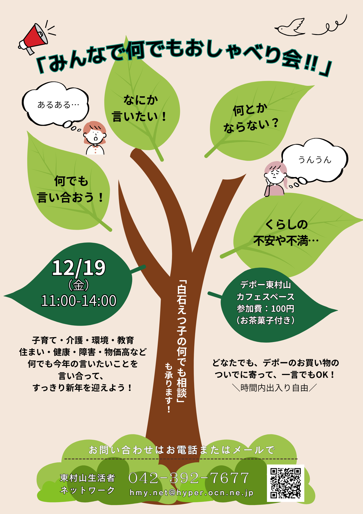 子育て・介護・環境・教育・住まい・健康・障害・・・物価高・などなど何でも、今年の言いたいことを言い合って、すっきり新年を迎えよう!